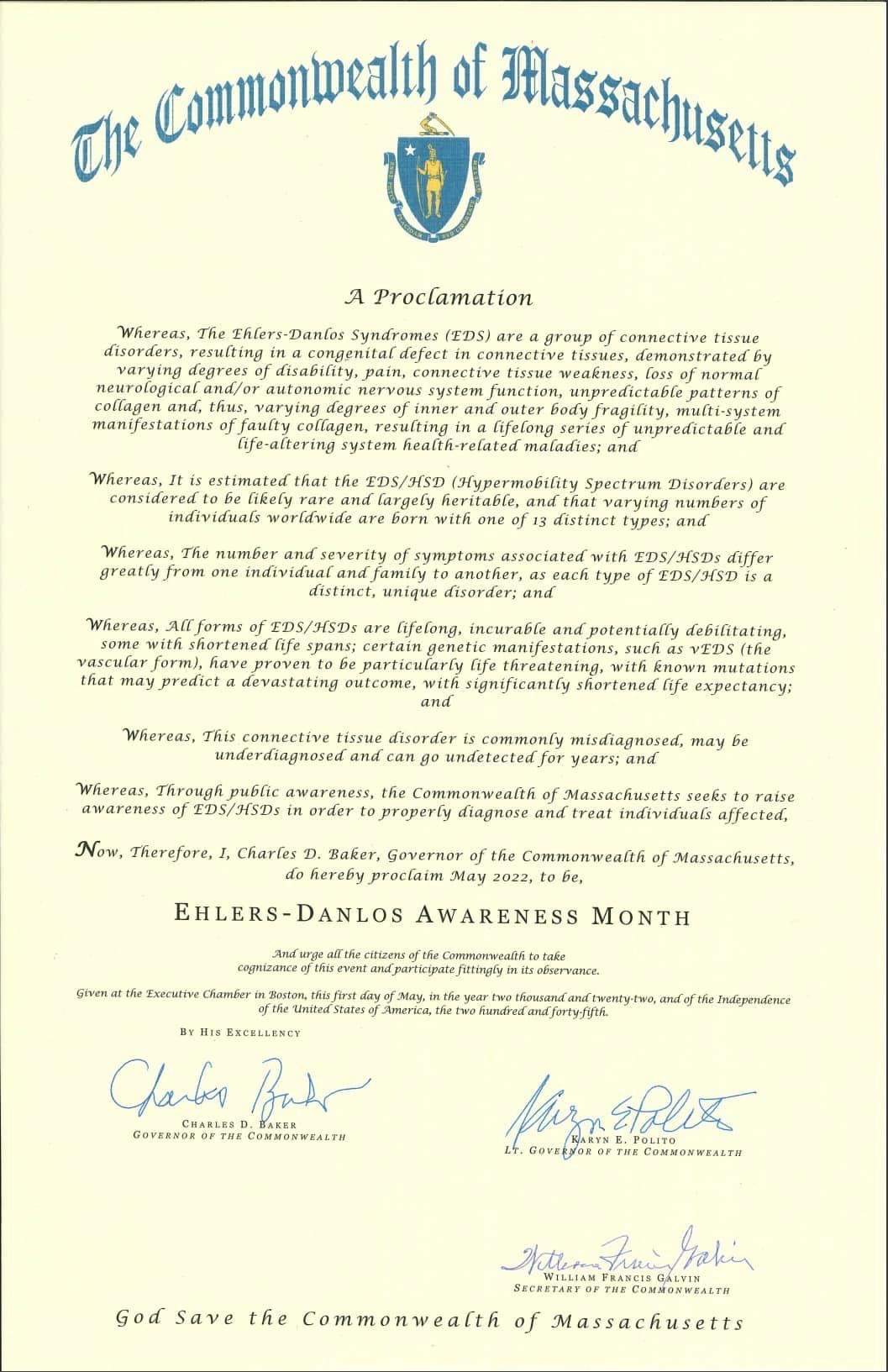 For years, Diana Cleaveland has led the effort to have May proclaimed Ehlers-Danlos Awareness Month in the state of Massachusetts. Below is a gallery of images documenting her successes and the fruitful support of so many talented and dedicated people in our community. You can click on the image of the proclamation to read its text.