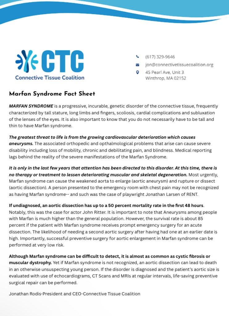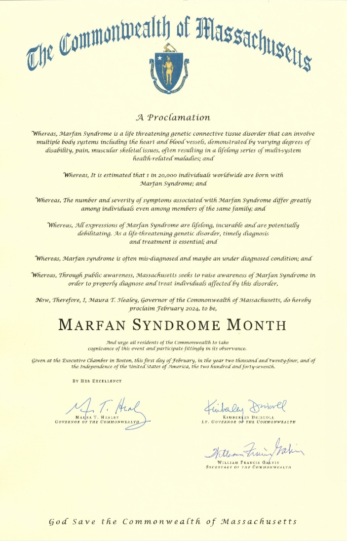 Thanks to the efforts of Jon Rodis, Debbie Mozes, and others who dedicated their time, Governor Healey has Proclaimed February 2024 as Marfan Syndrome Month. You can read more about this condition on the CTC Marfan Info Sheet, and be sure to share with your CTD friends! It could save someone’s life. Gratitude to all involved in this effort.